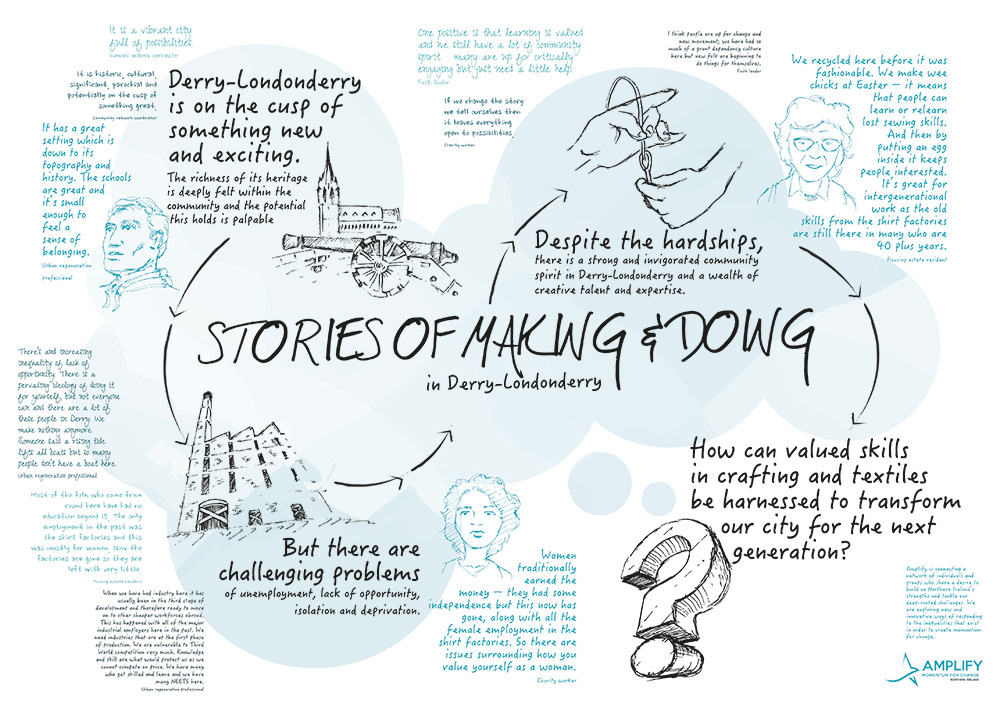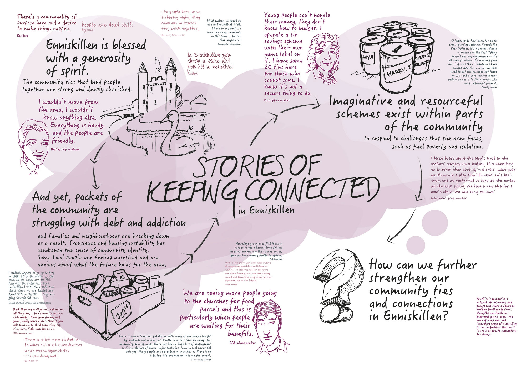 “This ‘story board’ research depiction going out into our communities with actual voices and hopes and dreams and realities is a masterpiece. I’m blown away by how much you have tapped into the spirit and heart of this place and the connectedness with our people that has been captured in this. It resonates with honesty and hope Alice….what more could we ask?!” – Community Outreach Worker, Belfast